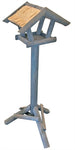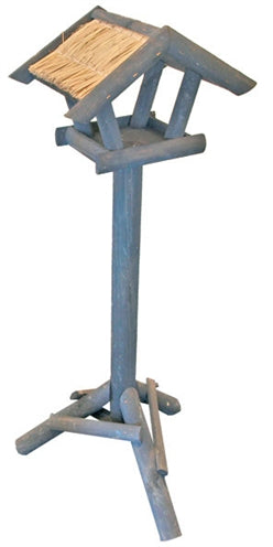 Klein voederhuis op poot gemaakt van grijs hout met een strodak. Zo heeft u een vaste plek in uw tuin of op uw balkon waar u de vogels kunt voeren en observeren.